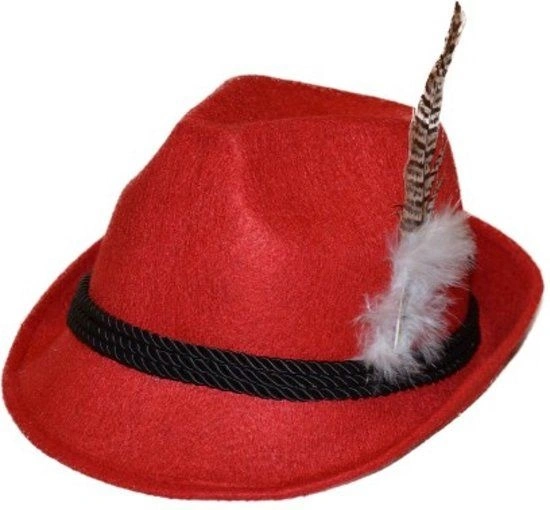 Rode tirolerhoed met wolvilt look en een veer.