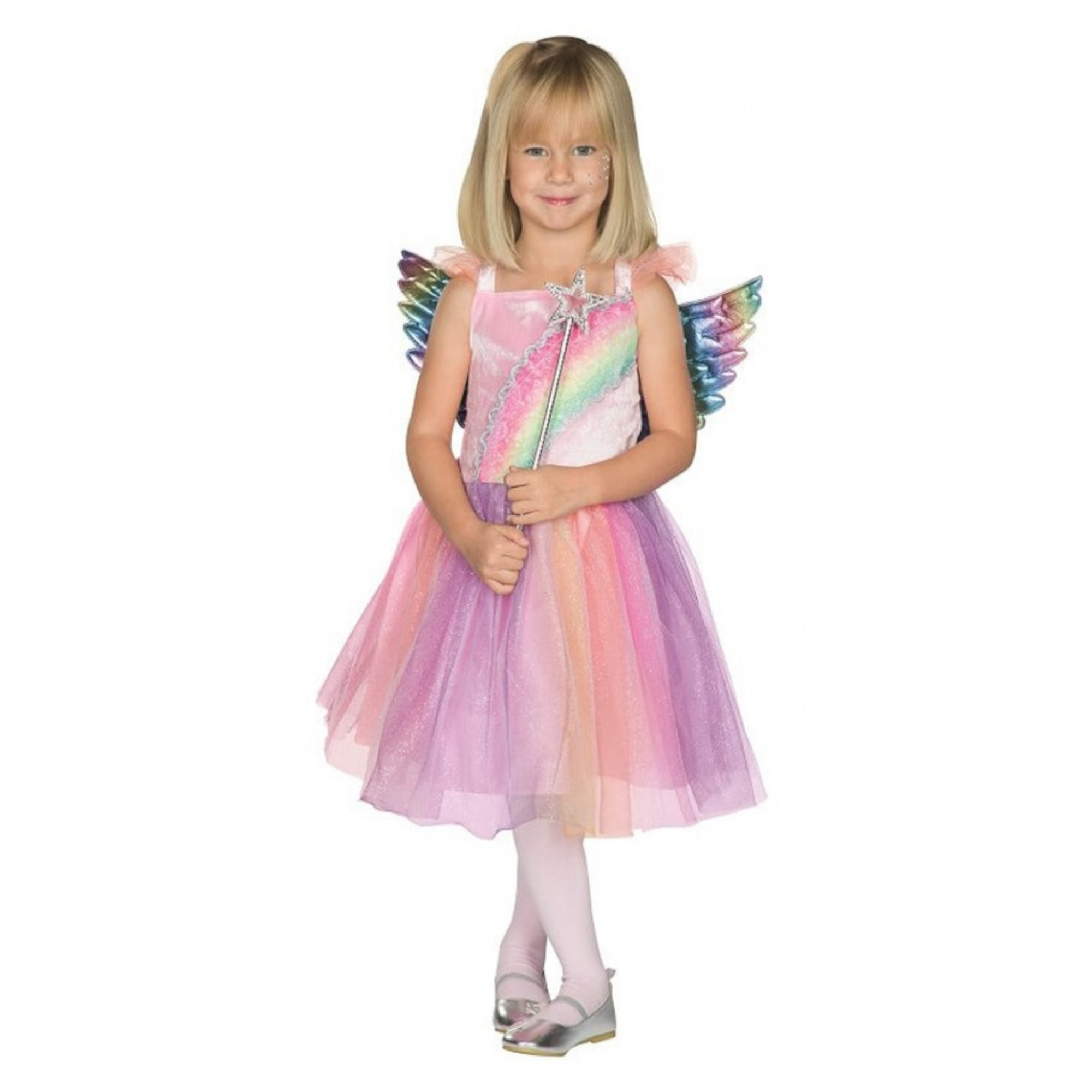 Regenboog fee kostuum van het merk PartyXplosion met vleugels. Dit jurkje is geschikt voor meisjes met maat 128.