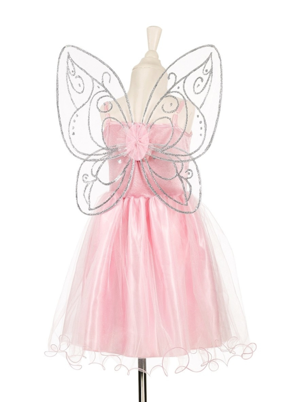 Deze geweldige roze verkleedjurk heeft zilveren afwerking op roze en heeft prachtige bijpassende vleugels.
