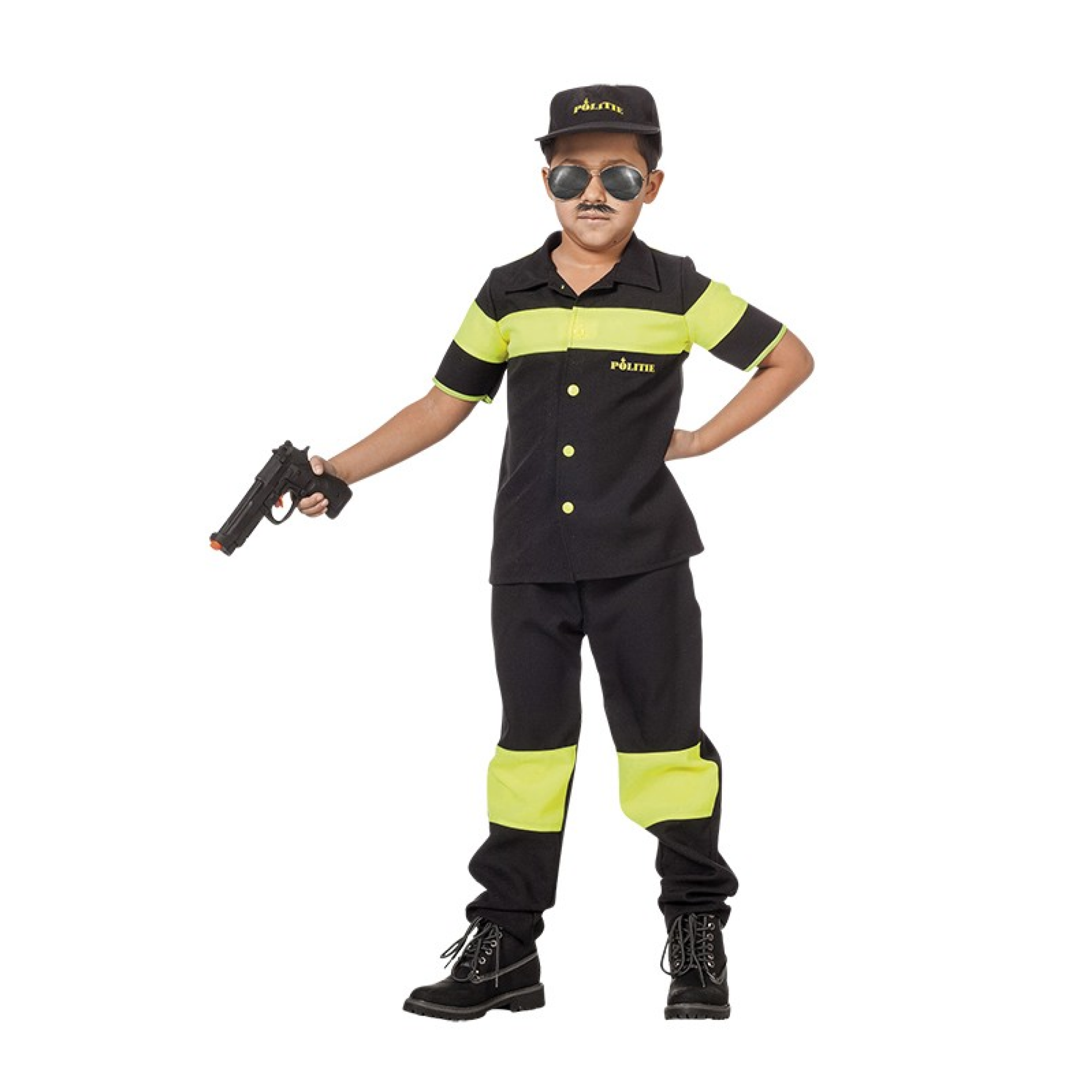 Politiekostuum van het merk Witbaard met gele strepen. Dit kostuum is geschikt voor kinderen met maat 104 en bevat een shirt en broek.